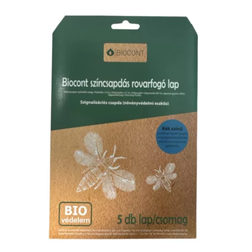 A Biocont színcsapdás rovarfogó lap – kék hatékony eszköz a repülő rovarok, például tripszek, levéltetvek és liszteske elleni védekezésre. A kék szín vonzza a rovarokat, amelyek a ragadós felületre tapadnak, így segít csökkenteni a kártevők számát a növényeken.