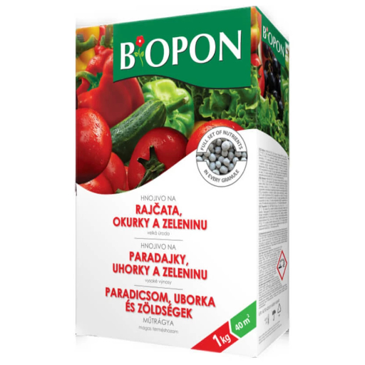 A Biopon Paradicsom, Uborka és Zöldség műtrágya kifejezetten a zöldségfélék egészséges növekedéséhez kifejlesztett granulált készítmény. Segíti a gyökérfejlődést, támogatja a bőséges terméshozamot és javítja a zöldségek minőségét.