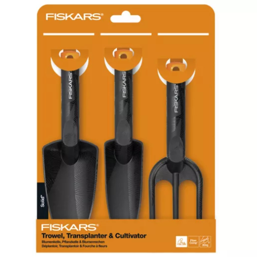 A Fiskars Solid ültető készlet elengedhetetlen társ a kerti munkákban. A szett tartalma: egy széles ültetőkanál, egy keskeny ültetőkanál és egy talajlazító villa. Anyaguk üvegszállal erősített műanyag, amely könnyű, mégis rendkívül strapabíró. Nem rozsdásodik, könnyen tisztítható és akasztólyukkal rendelkezik a tároláshoz.