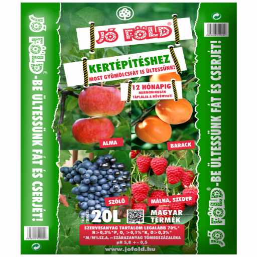 A Jó Föld kertépítéshez – most gyümölcsfát ültessünk 20 l kifejezetten gyümölcsfák és gyümölcstermő cserjék ültetéséhez összeállított földkeverék. Segíti a gyors begyökeresedést, és megfelelő tápanyagellátást biztosít az ültetés utáni időszakban.