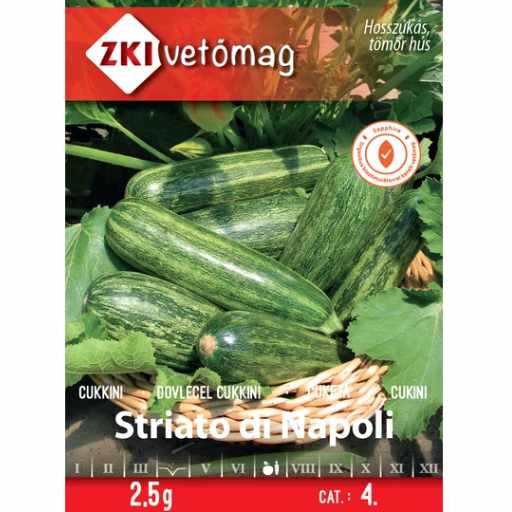 A ZKI Cukkini Striato di Napoli közép-korai érésű, csíkos, hosszúkás cukkini vetőmag. Ideális házikerti és profi termesztésre, friss fogyasztásra, pároláshoz, sütéshez, főzéshez és salátákhoz egyaránt.