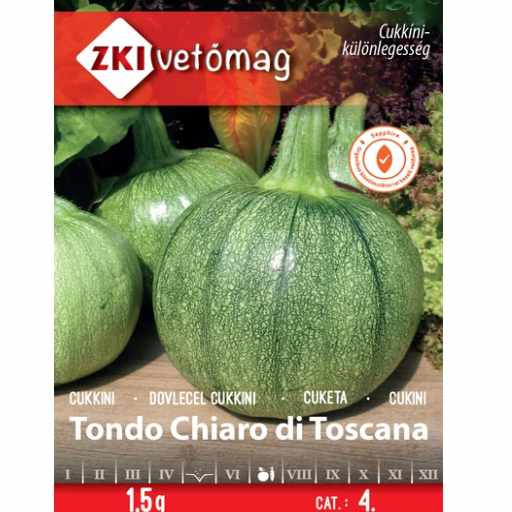 A ZKI Cukkini Tondo Chiaro di Toscana közép-korai érésű, kerek, világos zöld cukkini vetőmag. Ideális házikerti és profi termesztésre, friss fogyasztásra, pároláshoz, sütéshez, főzéshez és töltéshez egyaránt.