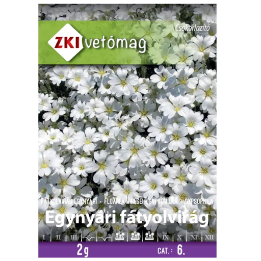 A ZKI Virág Egynyári fátyolvirág Fehér vetőmag egynyári, apró, fehér virágú fátyolvirágokat hozó növény. Ideális virágágyásokba, balkonládákba, szegélynövényként vagy kaspós ültetésre, elegáns, tiszta fehér virágzásával díszítve a kertet.